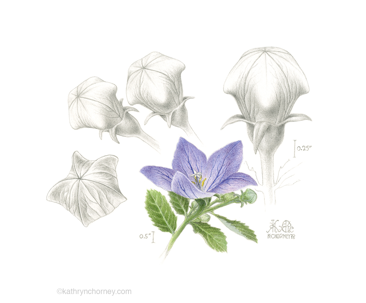 August 4, 2017 1179 × 978 Balloon Flower – Platycodon grandiflorum, 2015 A piece from summer 2016. Again, just a simple little garden plant, but presenting an element of natural wonder in how the pentagonal form of the bud blends into a rounded dome. Watercolour and graphite, approx 8″h x 10″w. ©Kathryn Chorney