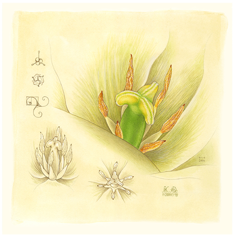 I included a few of the imaginary figures inspired by my observations of these and other natural forms. Three-part forms are very important to human symbology, representing everything from past-present-future, to father-mother-child. The triskelion – the three-part figure found in many places including the coat of arms of the Isle of Man – is explained by the phrase ‘whithersoever you throw it, it will stand’. As lovely a summary of natural adaptation as any I’ve encountered. Watercolour, colour pencil, & acrylic, 12″x12″. ©Kathryn Chorney