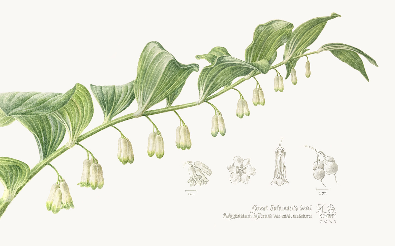 One of the first things that struck me about this beautiful native plant, was the visual interplay between the leaves and the row of pendant flowers on each stem — this relationship seemed musical to me, with the regularly-spaced groups of blossoms suggesting a rhythmic series of chords, and the lush, curvaceous leaves seeming to perform a dancing melody above. Watercolour and graphite, approx 13″ x 19″. ©Kathryn Chorney