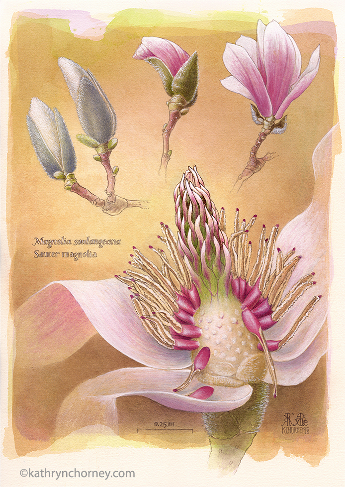 This species, one of the most popular garden magnolias, is a hybrid that dates from the 19th century. Magnolias however are among the most ancient flowering plants — dating back to the Tertiary period, 100 million years ago. We are most familiar with the petals of flowers, but to me the really fascinating forms are the reproductive structures hidden in the center. Watercolour, casein, acrylic, 17.5″h x 12.5″w. ©Kathryn Chorney (original in private collection)