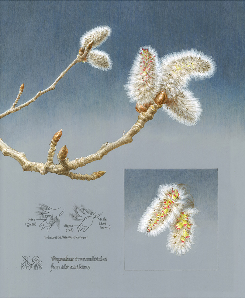 This subject has a strong personal resonance for me, for two reasons. One is the wonderful fact that whole groves of this tree are related, clones of a single organism, with the oldest known clone believed to be 80,000 years old. This seems to me a wonderful statement of the oneness and continuance of all life. The second reason is that in Western Canada where I encountered this specimen, the catkins emerge in April, and this is a timing I associate with a profound recent event in my life that saw me meditating intensively on connectedness and continuance. Colour pencil, gouache, and acrylic on drafting film; approx 13.5″ x 10.5″. ©Kathryn Chorney