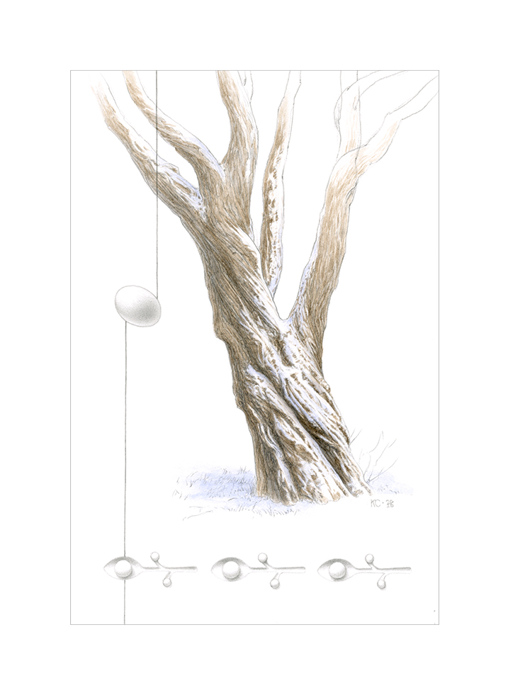 August 4, 2017 717 × 978 The Winter is Dreaming of Spring – I, 2016 This tree stands dormant under a fresh January snowfall. The egg and spoon-like forms (originally inner-monk sketchbook drawings) represent elements of a spring that has not yet arrived. Watercolour and graphite, 12″h x 8″w. ©Kathryn Chorney