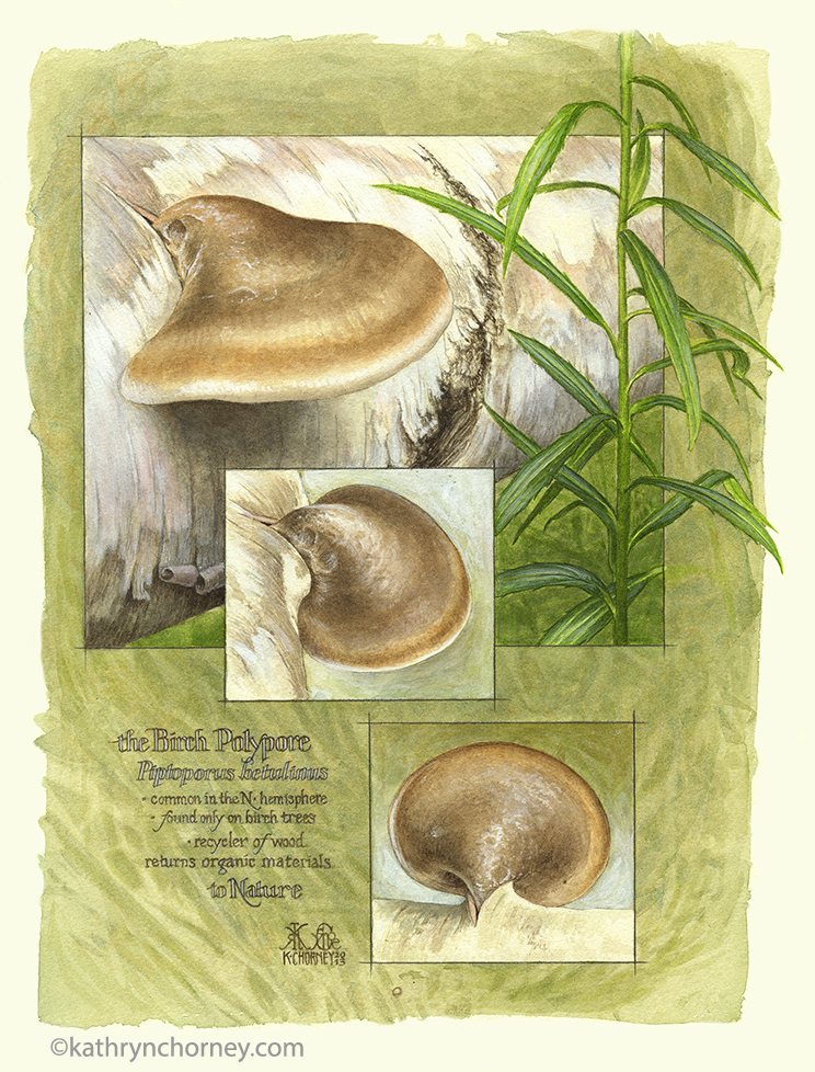 Found on a fallen birch in the woods north of Toronto. The goldenrod standing at right provides orientation to the horizontal treetrunk. Several view angles help emphasize the fascinating dimensional form of this fungal body. This piece was exhibited in the New York State Museum’s Focus on Nature XIII and subsequently accepted into the NYSM’s permanent collection of scientific illustrations. Watercolour, casein, acrylic, 14″h x 10.5″w. ©Kathryn Chorney