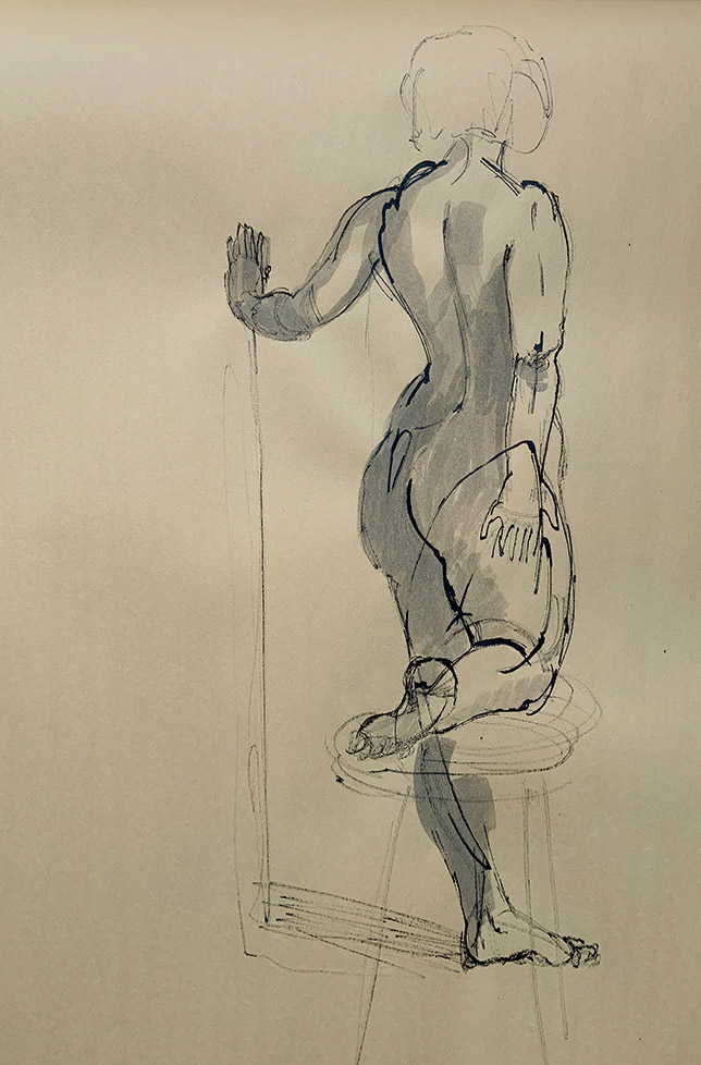 February 2, 2020 644 × 978 Female-Standing-BackView-KneeOnStool 5-minute study in ink line and wash.©Kathryn Chorney