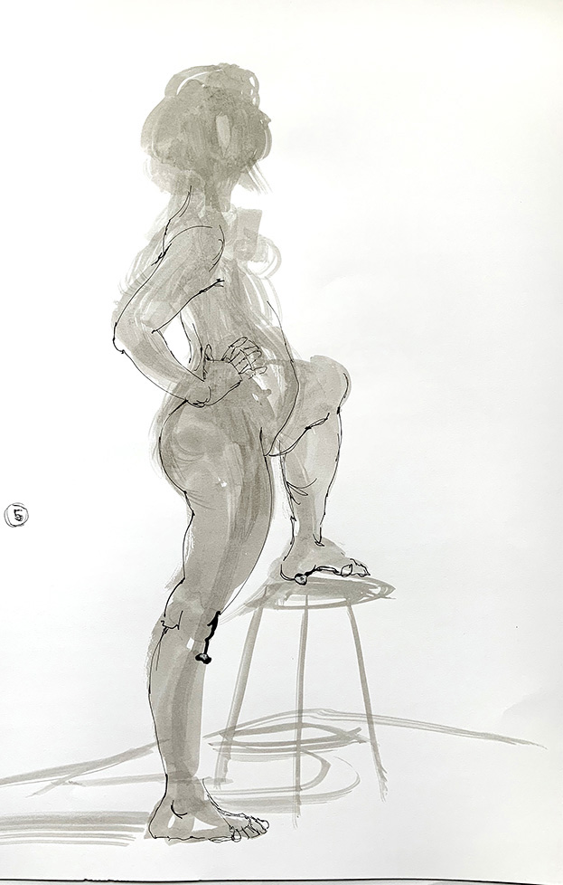 February 2, 2020 623 × 978 Female-Standing-FootOnStool 5-minute ink line and wash study.©Kathryn Chorney