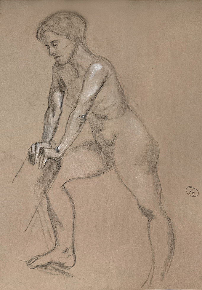 July 11, 2023 682 × 978 woman standing, leaning on chair black and white conte on toned paper, 15 min study