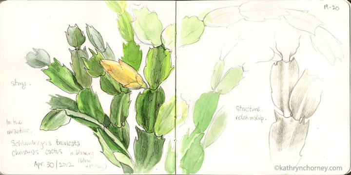 - Christmas Cactus 1, April. Nature happens indoors too — in April, my independently-minded Christmas Cactus began to bloom.