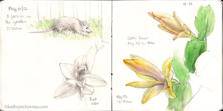 - Christmas Cactus 2, May. The cactus flowers continued to develop thru the following days. A possum paid a brief visit to the back garden – I did a quick sketch from memory.