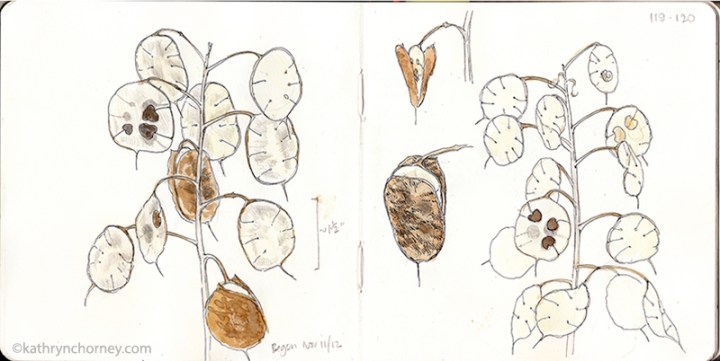 - Golden Rain Tree seed pods, September. The fall brings some of the most interesting journalling opportunities. I would pass this tree in my car driving home, getting more and more curious about the large clusters of hanging pods. One day I stopped and collected a few to take home and find out about them.