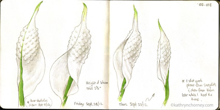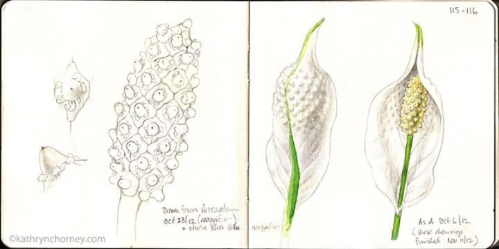 - Spathiphyllum – ‘Peace Lily’ 1, September. Another indoor journalling opp – the ‘Peace Lily’ (they’re not really lilies) in my faculty office began to open its spathe to reveal its flowerhead. (I’m left-handed, so it feels natural to me to draw sequences from right to left.)