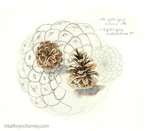 - Red Pine Cones, Summer. Spirals are some of the most intriguing structures in nature. This Red Pine cone has 8 spirals going in one direction, 13 in the other – two numbers from the mysterious Fibonacci sequence.