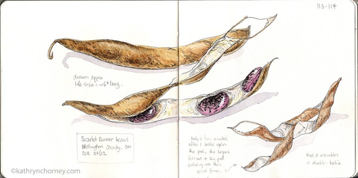 - Scarlet Runner Beans, October. I opened one runner-bean pod to see the brilliantly-coloured beans. A few minutes later, the bean pod had curled up into a double-helix form.