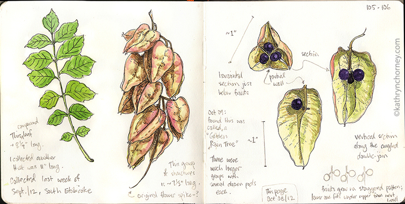 Golden Rain Tree seed pods, September. The fall brings some of the most interesting journalling opportunities. I would pass this tree in my car driving home, getting more and more curious about the large clusters of hanging pods. One day I stopped and collected a few to take home and find out about them.