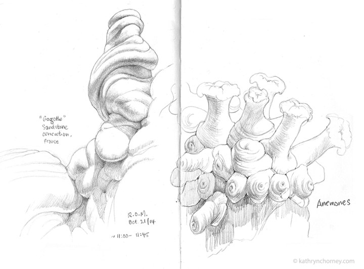 - Sandstone Concretion and Sea Anemones. I’ve mashed-up two sketchbook pages here — always wanted to see these two together; for some reason they remind me of each other. On the left is part of a sandstone concretion, a type of mineral crystal, from the collection of the Royal Ontario Museum. On the right is a group of sea anemones that I drew at Ripley’s Aquarium, Toronto. Both graphite pencil.