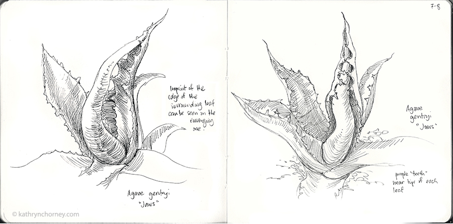 Agave, new leaves emerging. New Agave leaves emerge at the center of the plant, each one gradually breaking free of the one surrounding it. You can see the imprint of the surrounding leaf’s ‘jaws’ on the newly-emerged leaf. Royal Botanical Gardens, Burlington, Ontario. Pigma ink pen.
