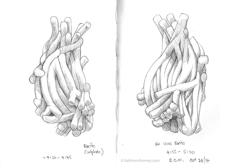 January 3, 2016 800 × 569 Barite crystals Barite Crystals, Royal Ontario Museum, Toronto. Two views of the same barite mineral crystal. Graphite pencil.