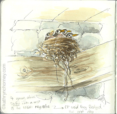 May 2013 — Four young robins absolutely stuffed into their little nest, up in the porch rafters of a stone farmhouse. It’s hard to believe they’d want to pack themselves in like this, but I swear this is just how they looked! Understandably, they fledged (left the nest) the following day.